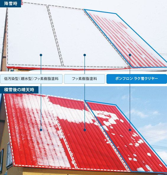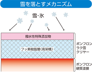 高架橋度のフッ素樹脂と特殊な撥水性添加物との相乗効果により雪を落としやすくします。