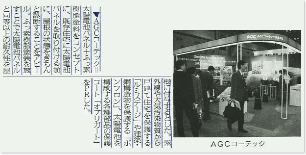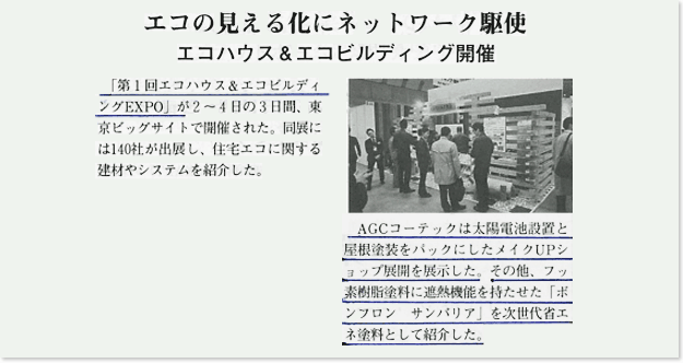 『Paint&Coatings Journal』、『塗料報知』で、AGCコーテックの「エコハウス&エコビルディングEXPO」出展ブースの記事が掲載されました。