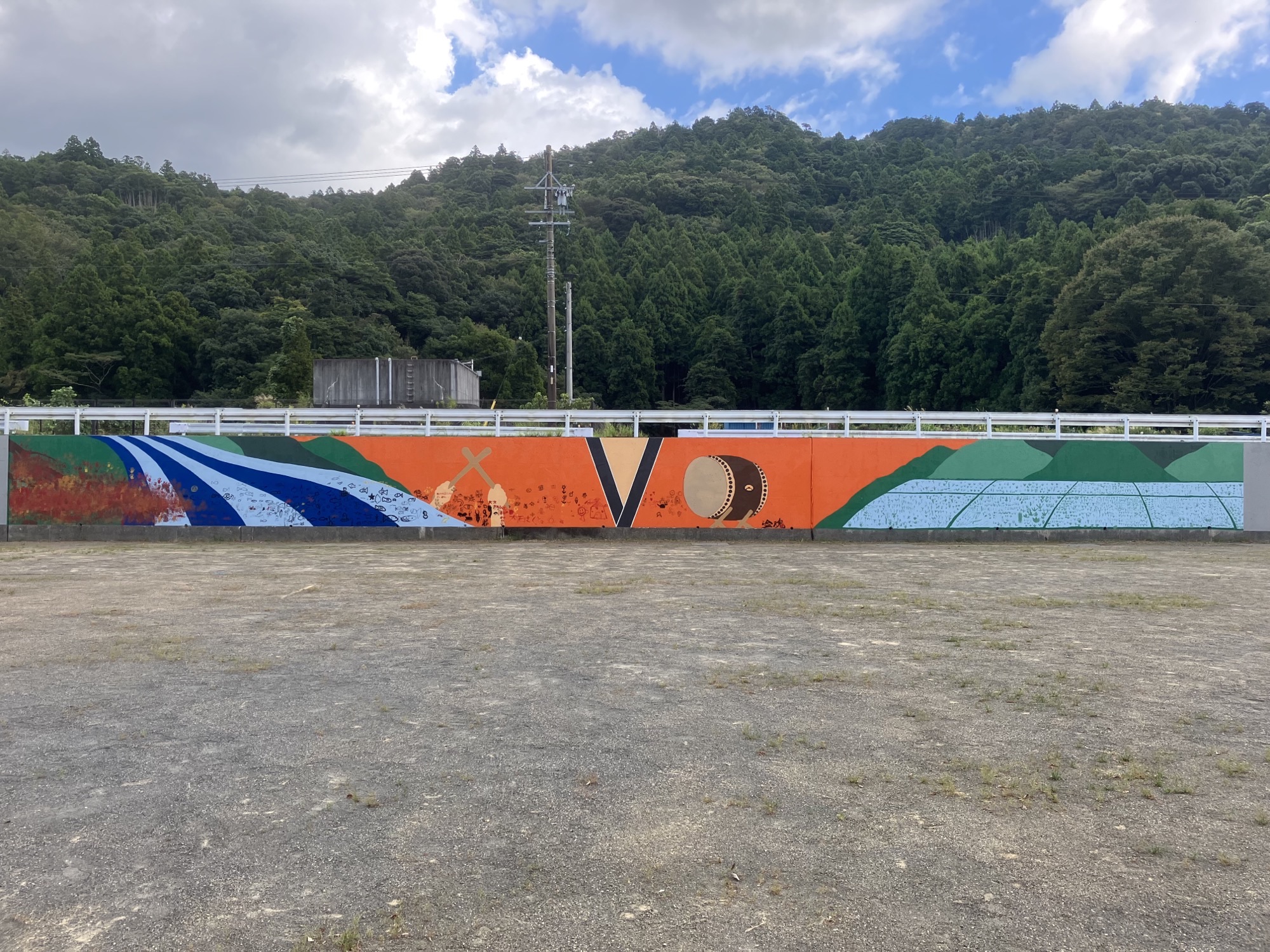 本小学校は5つの小学校の統合により2023年度末で閉校となりますが、既存校舎を展示用施設や博物館課の執務室や収蔵品の保管スペースとして引き続き活用予定とのことです。ボランティア当日前に『塗魂ペインターズ』の皆様が運動場の壁に絵を描いて頂き、最後の仕上げに全校児童が手形のもみじを楽しそうに描いたり、各々が好きな絵を描き、素敵な思い出深い壁画が完成しました。閉校後も壁画は、児童の記憶の中で楽しい思い出と一緒に今後も鮮やかに残るでしょう。