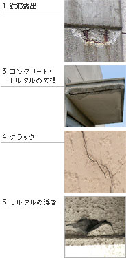 内部鉄筋が錆び、錆び汁が外壁表面出てきた状況 - コンクリート・モルタルの欠損