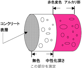 したがって、中性化はコンクリ-トの材質の経年劣化の基本的一要因であり建造物の構造耐久力の低下にまで至る劣化要因であることから、事前の調査診断作業の中でも中性化の測定、分析は軸をなす作業となる。